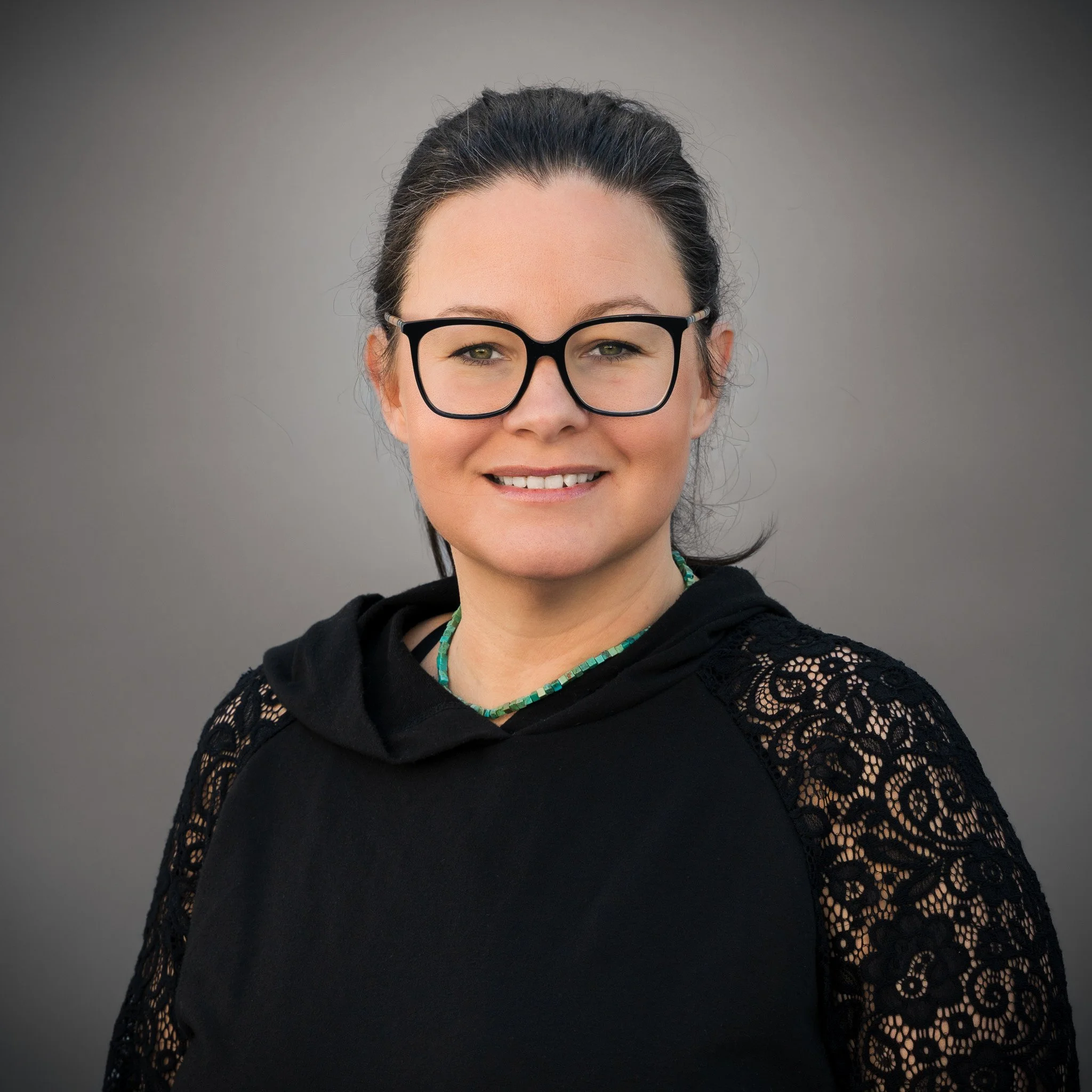 • Smiling woman with braided blonde hair wearing a black top and necklace, standing in front of a stone wall.